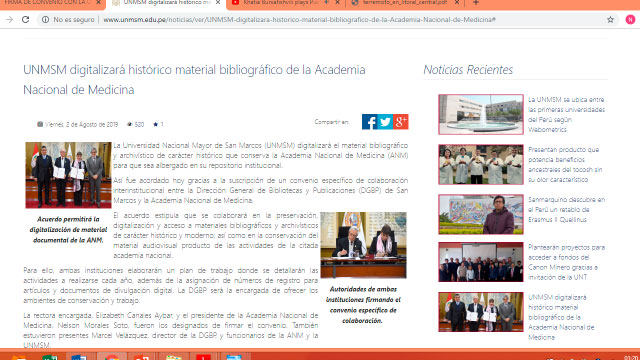 En ejecución de los acuerdos de nuestras convenciones, el día 2 de agosto se firmó un Convenio Específico entre la Universidad Nacional Mayor de San Marcos y la Academia Nacional de Medicina para la digitalización de documentos de nuestra Biblioteca Histórica y su disponibilidad en las redes sociales.