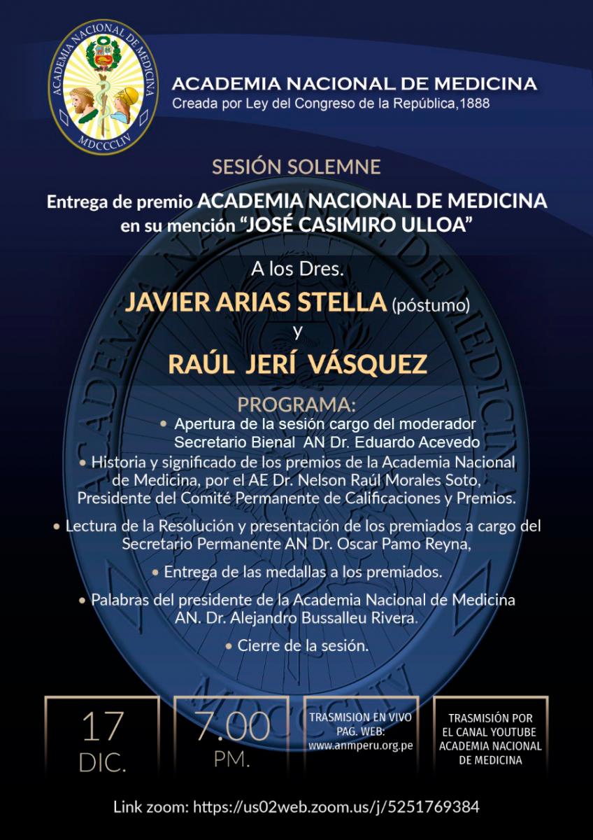 Sesión Solemne: Entrega de premio ACADEMIA NACIONAL DE MEDICINA en su mención "JOSE CASIMIRO ULLOA"