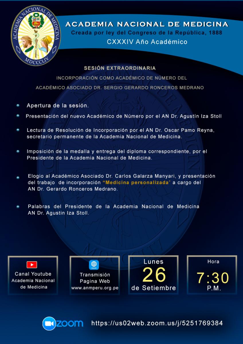 Sesión Extraordinaria: Incorporación como Académico de Número del AA Dr. Sergio Ronceros Medrano